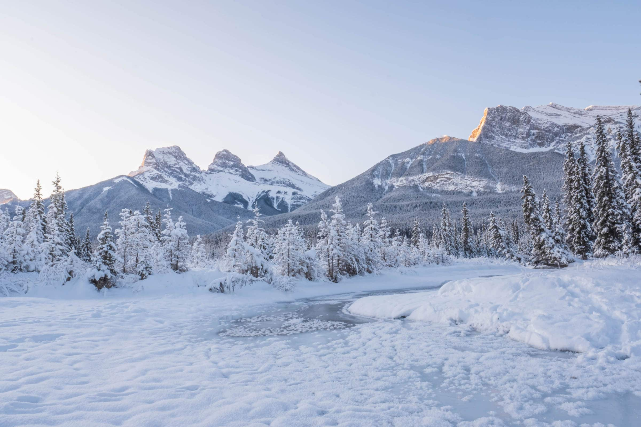 Located just outside Canmore, Three Sisters Lookout offers one of the most recognizable mountain views in the region. In winter, the Three Sisters rise sharply against pale skies, their snow-covered ridgelines creating strong contrast and dramatic lines.
